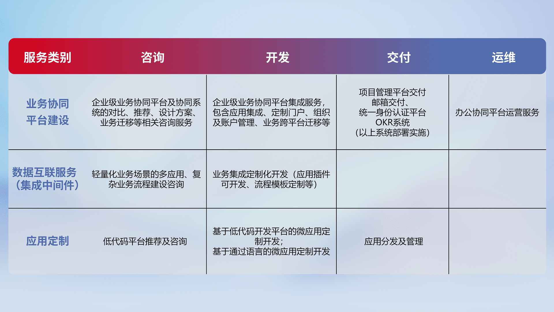 针对钉钉、、、、企微、、、IDaas等平台级产品提供产品的规划、、、、方案、、交付、、、定制化开发等服务,,实现如统一协同办公、、、智能客户服务、、、、混合会议管理、、、智能数据查询、、、等业务场景,,实现数字化转型。。。
